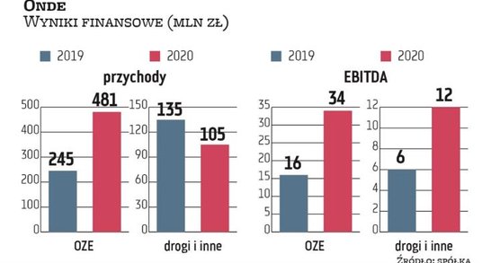 Jeśli chodzi o generalne wykonawstwo, Onde szacuje udział w rynku farm wiatrowych na 50 proc., a fotowoltaicznych na 10 proc. – tu z ambicją znacznego zwiększenia pozycji. Uzupełnieniem będą kontrakty drogowe na drogi lokalne i ekspresowe – z tego biznesu spółka wyrosła. Portfel zamówień na koniec marca wynosił 1 mld zł.