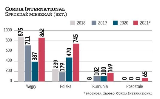 Przeliczając na naszą walutę, w 2020 r. Cordia International miała ponad 860 mln zł przychodów i 85 mln zł zysku operacyjnego z przekazania 961 lokali na Węgrzech i 789 w Polsce. Przejęcie pogrążonego w kłopotach finansowych i operacyjnych Polnordu z jednej strony obniżyło marżę brutto ze sprzedaży do 17,8 proc. (bez Polnordu rentowność wynosiła 24 proc.). Z drugiej, pozwoliło zaksięgować zysk z okazyjnego przejęcia – zysk netto Cordii wyniósł 271 mln zł. Węgierskie spółki z rynku nieruchomości rozwijają się dzięki czynionemu z rozmachem wsparciu banku centralnego tego kraju, który stymuluje rynek obligacji korporacyjnych. Efektem jest ekspansja Cordii International, Grupy Wing (przejęcie Echo Investment) czy GTC (zamknięta właśnie emisja papierów warta 500 mln euro). ar