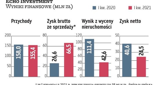 Sojusz z Archicomem to także perspektywa zwiększenia wyników finansowych. Echo w I kwartale br. przekazało 154 mieszkania, o 19 proc. mniej niż rok wcześniej i zaksięgowało 72 mln zł przychodów, o 4 proc. mniej. Zysk brutto ze sprzedaży skurczył się o 9 proc., do 13,9 mln zł. Marża wyniosła 19,4 proc. wobec 20,4 proc. rok wcześniej. Prezes Lindberg podkreślił, że rentowność zależy od miksu przekazywanych lokali i w całym 2021 r. powinna ona być wyższa niż 20 proc. W IV kwartale ub.r. marża wyniosła 25 proc. z uwagi na duży wkład projektów warszawskich.