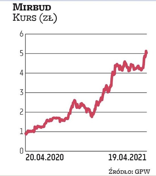 W 2020 r. Mirbud był gwiazdą indeksu WIG-budownictwo, papiery podrożały o 208 proc., do 3,35 zł. Szef firmy i główny akcjonariusz Jerzy Mirgos otrzymał nominację do naszej nagrody Byki i Niedźwiedzie w kategorii prezes roku.