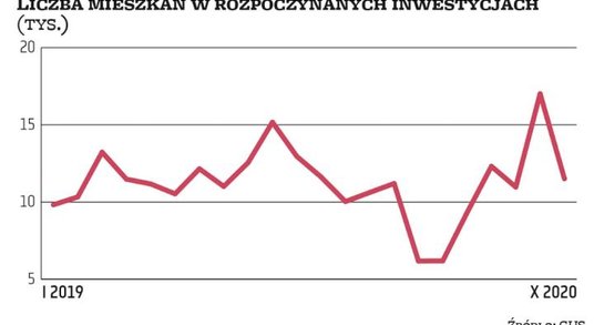 W październiku deweloperzy ruszyli z budową ponad 11,5 tys. mieszkań. To o 24 proc. mniej niż rok wcześniej – ale wtedy październik był najlepszym miesiącem roku. We wrześniu br. padł miesięczny rekord (jeśli chodzi o okres monitorowany przez GUS) liczby lokali, których budowa wystartowała: 17 tys. Tym samym w październiku br. deweloperzy wrócili do średnich poziomów tegorocznych nieobjętych lockdownem miesięcy. Licząc po dziesięciu miesiącach, deweloperzy ruszyli z budową 105,3 tys. lokali, o 10 proc. mniej rok do roku.