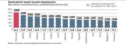 W Warszawie mieszkanie wynajmiemy za 2,6 tys. zł (mediana), co przy całorocznym obłożeniu da 6,13-proc. rentowność. W Krakowie na wynajem lokalu trzeba mieć 1,8 tys. zł. Jeśli najemca zajmie go na cały rok, rentowność wyniesie 5,74 proc., jeśli miesiąc krócej – 5,17 proc. Wynajem mieszkania we Wrocławiu to koszt 2 tys. zł. Zwrot z inwestycji to 6,37 proc. brutto przy pełnym obłożeniu.