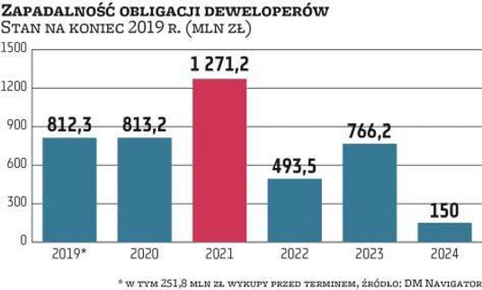 3,5 mld zł sięga wartość obligacji, jakie notowani na Catalyst deweloperzy mieszkaniowi muszą wykupić w latach 2020–2024. Jak szacuje DM Navigator, w tym roku zapada dług o wartości 789 mln zł (w styczniu wykupiono już papiery za 24 mln zł), a w przyszłym już 1,27 mld zł. W 2019 r. spółki wykupiły obligacje o wartości 812 mln zł, z czego 252 mln zł stanowiły wykupy przedterminowe. Jednocześnie deweloperzy uplasowali papiery o wartości prawie 971 mln zł.