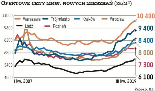 Tak wynika z najnowszych analiz HRE Think Tanku, które publikujemy pierwsi. Wynika z nich, że choć ceny mieszkań w wielu miastach są wyższe niż w szczycie poprzedniej hossy w 2007 r., to o bańce nie ma mowy. – Szacunki NBP za II kw. pokazują, że za średnią miesięczną pensję Polacy mogą dziś kupić 0,82 mkw. przeciętnego mieszkania w dużym mieście – podaje Michał Cebula, prezes Heritage Real Estate Think Tank. – Wynik jest bez porównania lepszy niż ten z III kw. 2007 r. (0,48 mkw.). Wtedy mieliśmy mieszkaniową bańkę. Lokale musiałyby jeszcze zdrożeć o ponad 70 proc., aby pensja przeciętnego Polaka wystarczyła dziś na zakup tak samo skromnej powierzchni jak u szczytu ostatniej hossy. Z danych firmy doradczej JLL wynika, że w III kw. 2007 r. średnie ofertowe ceny mkw. mieszkań wynosiły w Warszawie 8,5 tys. zł, w III kw. br. było to 10,4 tys. zł. W Krakowie przeciętne ceny mkw. nowych lokali wzrosły w ciągu 12 lat z niespełna 7,5 do 8,4 tys. zł, w Trójmieście – z ponad 8,4 do 9,4 tys. zł.