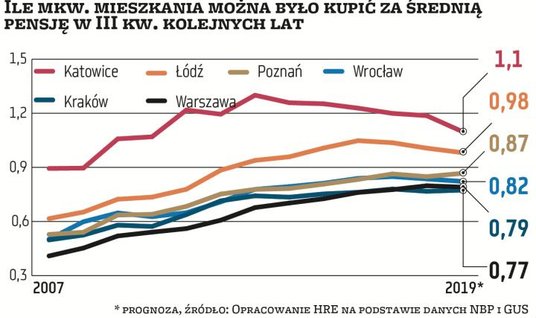 Bartosz Turek, analityk HRE Investments, oblicza (za GUS i NBP), ile mkw. mieszkania kupimy za średnią pensję. I tak, w III kw. 2007 r. w Warszawie można było mieć 0,50 mkw. W III kw. br. (prognozy) jest to 0,77 mkw. W Krakowie możliwości nabywcze wzrosły z 0,41 mkw. do 0,79 mkw. We Wrocławiu z 0,50 do 0,82 mkw., w Gdańsku z 0,56 do 0,76 mkw., w Poznaniu z 0,53 do 0,87 mkw., a w Łodzi z 0,62 do 0,98 mkw. Coraz więcej metrów za pensję możemy też kupić w mniejszych miastach, np. w Kielcach możliwości wzrosły w ciągu 12 lat z 0,71 do 1,05 mkw.