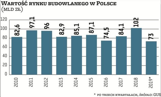 – Dla śledzących na bieżąco sytuację na rynku budowlanym niekorzystne dane za październik nie są raczej dużym zaskoczeniem – mówi Bartłomiej Sosna, ekspert w firmie analitycznej Spectis. – Już rok temu prognozowaliśmy, że po dwucyfrowych wzrostach w latach 2017–2018 realna dynamika rynku w 2019 r. wyniesie ok. 5 proc. – dodaje. Zdaniem eksperta perspektywy na 2020 r. nie są zbyt optymistyczne. – Kalkulowana przez nas dynamika zagregowanego portfela zamówień 20 wiodących wykonawców na koniec I połowy br. pierwszy raz od dziesięciu kwartałów była ujemna (-2 proc. rok do roku) – wskazuje Sosna. – Obserwujemy hamowanie, jeśli chodzi o budownictwo niemieszkaniowe. Nadal wyraźnie maleje liczba przetargów publicznych, zwłaszcza samorządowych. Od kilku miesięcy mamy wyraźnie mniej kilometrów autostrad i dróg ekspresowych w fazie budowy – wylicza. Wszystkie te zjawiska w najbliższych kwartałach znajdą odzwierciedlenie w danych o produkcji budowlano-montażowej. Z pozytywnych trendów Sosna wskazuje utrzymujący się wysoki poziom inwestycji mieszkaniowych i ożywienie na kolei.