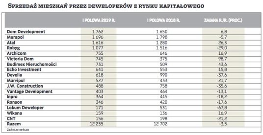 Łącznie notowani na GPW i Catalyst deweloperzy w I połowie 2019 r. sprzedali 12,3 tys. mieszkań, o 3,5 proc. mniej niż rok wcześniej i 9,7 proc. mniej niż w I połowie rekordowego dla branży 2017 r. W samym II kwartale spółki znalazły nabywców na 6,16 tys. lokali, o ponad 5 proc. więcej rok do roku i 0,9 proc. więcej kwartał do kwartału. Więcej niż dane łączne o kondycji rynku mówią wyniki poszczególnych spółek – a te są bardzo zróżnicowane (patrz tabela). Victoria Dom w I połowie tego roku niemal podwoiła wynik, na drugim biegunie znalazło się Lokum Deweloper, które zawarło o 68 proc. umów mniej niż rok wcześniej. Osiem analizowanych przedsiębiorstw zanotowało poprawę sprzedaży rok do roku, dziewięć pogorszenie.