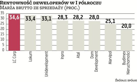 LC Corp w I półroczu wypracował prawie 35 proc. marży brutto ze sprzedaży, ponad 30-proc. rentowność uzyskały jeszcze Lokum Developer i Unidevelopment z grupy giełdowego Unibepu.