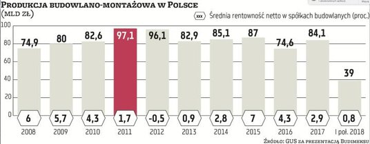 Jak wskazują analitycy zajmującej się ubezpieczaniem należności firmy Euler Hermes, branża budowlana doświadcza stałego wzrostu liczby niewypłacalności. Na koniec I półrocza liczba niewypłacalności wzrosła o 22 proc. wobec analogicznego okresu 2017 r. i o 35 proc. wobec połowie 2016 r. Zdaniem ekspertów branża potrzebuje wsparcia w postaci wzięcia odpowiedzialności za sytuację przez zamawiających – w dużej mierze podmioty publiczne, które doprowadziły do skomasowania wielu inwestycji w jednym czasie, nakładając to na boom w budownictwie kubaturowym, głównie mieszkaniowym.