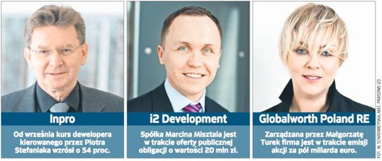 Od września po długotrwałym stabilnym wzroście indeks WIG-nieruchomości mocno się waha – teraz wyszedł na zero. W tym czasie tylko sześć z 32 firm zdecydowanie pokonało wskaźnik, a dwa razy tyle przyniosło wynik znacznie gorszy. Trudno znaleźć regułę. Zdecydowaną gwiazdą jest Inpro, deweloper mieszkaniowy z Trójmiasta, szczycący się wysoką rentownością. Kurs Inpro wzrósł o 53,5 proc. Na drugim znalazł się inny lokalny gracz – wrocławski i2 Development, którego kapitalizacja zwiększyła się o blisko 20 proc. Na drugim biegunie znalazły się Wikana (-71 proc.) i Tower Investments (-56 proc.).