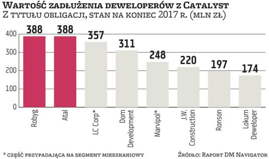 Jak szacuje DM Navigator, w całym ubiegłym roku deweloperzy wypuścili papiery za około 1,3 mld zł, a na wykup przeznaczyły około 600 mln zł. W kolejnych kwartałach 2018 r. zapadają obligacje o wartości 478 mln zł, a w 2019 r. o wartości 745 mln zł. Można się więc spodziewać kolejnych emisji, m.in. na refinansowanie tych zobowiązań.