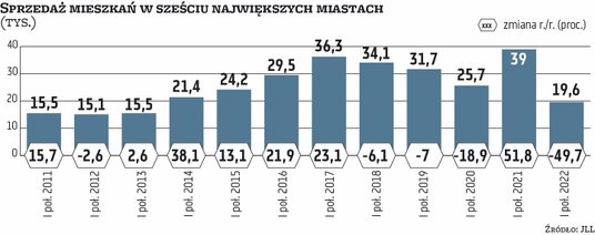 Według wstępnych szacunków JLL, w II kwartale w sześciu największych miastach deweloperzy sprzedali (wliczając płatne rezerwacje) 9,2 tys. mieszkań, o 53 proc. mniej wobec rekordowego II kwartału 2021 r. i o 11,5 proc. mniej wobec I kwartału br., kiedy obserwowane było już stygnięcie rynku. To najniższa sprzedaż od objętego lockdownem II kwartału 2020 r., kiedy kupiono 6,9 tys. lokali.