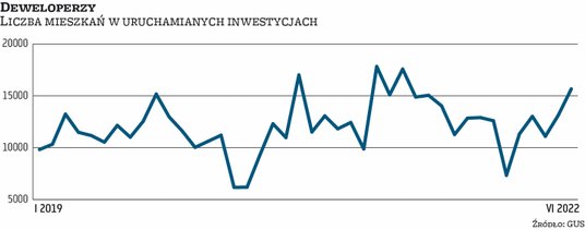 Rozpoczęcie stawiania aż 15,7 tys. mieszkań zadeklarowali w czerwcu powiatowym inspektorom nadzoru budowlanego deweloperzy – podał GUS. To rząd wielkości, jaki widziany był wiosną i latem ub.r., kiedy rynek opanowała budowlana gorączka napędzana rekordowym popytem na mieszkania. Dziś otoczenie rynkowe jest diametralnie inne: popyt i sprzedaż siadły, bo po szybkim i mocnym wzroście stóp procentowych wyschło źródło taniego kredytowania. Sami deweloperzy konsekwentnie podtrzymują, że wolą wprowadzać na rynek mniej lokali, niż kosztem marży redukować ceny. Jednocześnie czerwiec to aż 26 tys. mieszkań w uzyskanych przez firmy pozwoleniach na budowę, czyli nowy rekord. Miesięczna norma w ostatnich latach to mniejsze lub większe kilkanaście tysięcy.