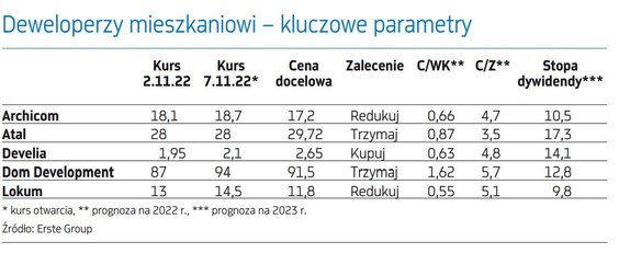 Na otoczenie makro i nastroje inwestorów giełdowych, w tym spółek deweloperskich, pozytywnie przełożyłby się koniec rosyjskiego najazdu na Ukrainę. Pozytywnym czynnikiem byłoby też złagodzenie rekomendacji S (zalecenie Komisji Nadzoru Finansowego, by banki, badając zdolność kredytową, sprawdzały, czy klient udźwignąłby pożyczkę przy stopie o 5 pkt proc. wyższej od bieżącej). Obu tych czynników, jako niepewnych, Erste nie uwzględnia w modelu.