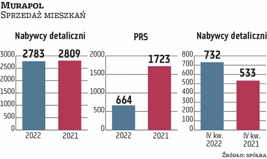 Dodatkowo Murapol sprzedał w ub.r. 664 mieszkania inwestorowi PRS (funduszowi Ares, swojemu właścicielowi) wobec 1,7 tys. rok wcześniej. W sumie w 2022 r. deweloper sprzedał więc 3447 lokali, o 24 proc. mniej niż w 2021 r.