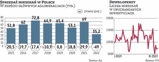 W 2022 r. liczba mieszkań w odpalonych inwestycjach skurczyła się – według danych GUS – o ponad 30 proc., ze 166 tys. do około 116 tys. W tym roku oczekiwana jest jeszcze mocniejsza redukcja, do 70–80 tys. lokali. Z ankiety przeprowadzonej przez PZFD wśród części członków wynika, że niemal wszyscy respondenci przykręcą kurek, 48 proc. z nich o ponad połowę. – Tak radykalne ograniczenie liczby projektów deweloperskich odbije się na całej gospodarce. Potencjalny spadek zatrudnienia zostanie zaobserwowany zarówno u samych deweloperów, jak i w branżach ściśle powiązanych – wskazał Kozierkiewicz.