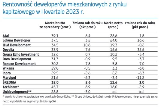 Dziesięć spółek deweloperskich z rynku kapitałowego, które opublikowały sprawozdania finansowe, w pierwszym kwartale tego roku wypracowało średnią marżę brutto ze sprzedaży wynoszącą 32 proc., o 2,6 pkt proc. więcej niż rok wcześniej. Rentowność netto wyniosła 11,6 proc., o 1 pkt proc. więcej.