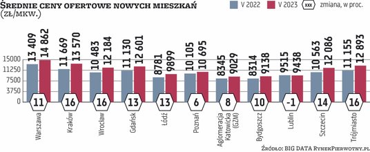 Mieszkania drożeją. Jak podaje portal RynekPierwotny.pl, średnie ceny ofertowe nowych mieszkań w Warszawie w ciągu roku (maj 2022/maj 2023) poszły w górę o 11 proc., do ponad 14,8 tys. zł za mkw. W Krakowie – o 16 proc., do niespełna 13,6 tys. zł, we Wrocławiu – także o 16 proc., do niemal 12,2 tys., w Gdańsku i Łodzi – po 13 proc. – do 12,6 i 9,9 tys. zł, odpowiednio. Miesięczne wzrosty (maj/czerwiec br.) są już dużo mniejsze, często poniżej 1 proc.