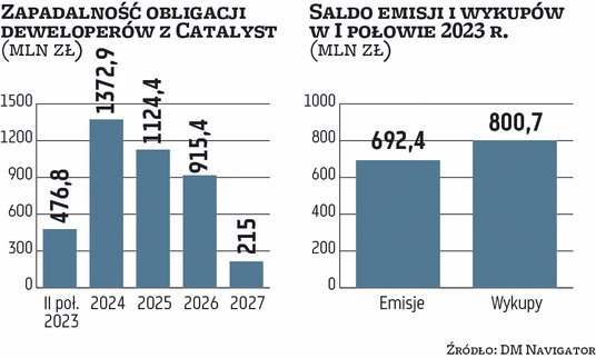 Prawie pół miliarda złotych wynosiła na koniec czerwca wartość długu notowanych na Catalyst deweloperów mieszkaniowych z tytułu wyemitowanych obligacji – wynika z szacunków Domu Maklerskiego Navigator. Wartość papierów do wykupu w przyszłym roku wynosiła prawie 1,4 mld zł, a w 2025 r. ponad 1,1 mld zł.
