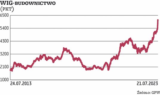 Indeks WIG-budownictwo ma za sobą imponujący rajd, w samym lipcu notowania wzrosły o ponad 16 proc., do 6,1 tys. pkt, poziomu najwyższego od 2008 r. Odkąd giełdowe indeksy zaczęły odbijać w październiku ub.r., grupujący szerokie spektrum spółek związanych z budownictwem indeks zyskał niemal 80 proc.