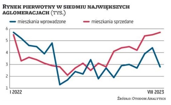 W sierpniu w siedmiu największych aglomeracjach deweloperzy podpisali z klientami 5,7 tys. umów, trzeci miesiąc z rzędu notując wzrost sprzedaży mieszkań – wynika z szacunków Otodom Analytics. Cały czas na wysokim poziomie utrzymują się też rezerwacje lokali (od początku roku to 2,4–2,7 tys. miesięcznie). A mimo przebudzenia popytu firmy od miesięcy wprowadzają do oferty mniej mieszkań, niż wynosi sprzedaż.