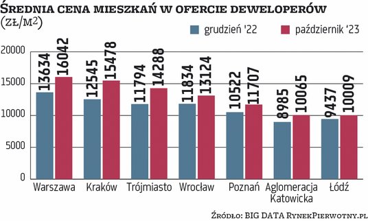 Program tanich kredytów podbił ceny nieruchomości. Z danych BIG DATA RynekPierwotny.pl wynika, że średnie ceny mieszkań w ofercie deweloperów od grudnia 2022 r. (zapowiedzi „Bk 2 proc.” pojawiły się na początku br.) do października wzrosły o 18 proc., przekraczając 16 tys. zł za mkw. W Krakowie lokale zdrożały w tym czasie o 23 proc., do niemal 15,5 tys. zł za mkw., w Trójmieście – o 21 proc., do niespełna 14,3 tys. zł, a w Poznaniu – o 11 proc., do 11,7 tys. zł za mkw.