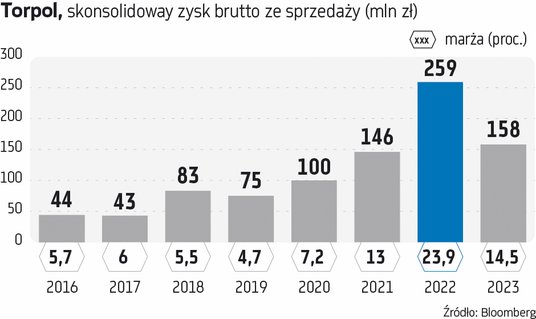 W 2023 r. pierwszy raz od debiutu na GPW zarząd rekomendował, by spółka nie wypłacała dywidendy – z uwagi na trudne otoczenie makro i konieczność posiadania poduszki finansowej w realiach spowolnienia na rynku. W 2023 r. Torpol miał 102 mln zł skonsolidowanego zysku netto, czyli 4,44 zł na akcję. Grupa ma bardzo niskie zadłużenie, 0,52 mld zł gotówki, a na lokatach zarobiła 25 mln zł.