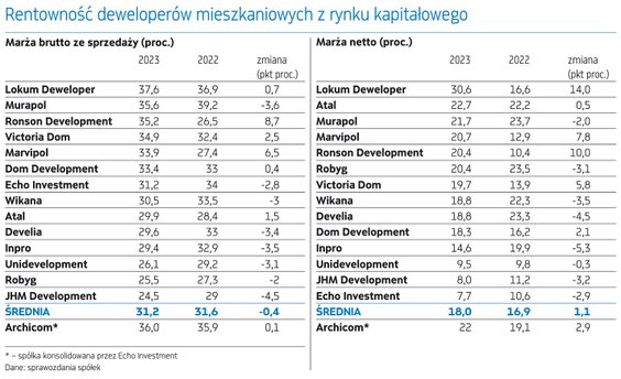 Marża brutto ze sprzedaży to w uproszczeniu stosunek kosztów zakupu gruntów i budowy do przychodów ze sprzedaży mieszkań. Poza tym od przychodów trzeba odjąć koszty sprzedaży, marketingu, funkcjonowania samej spółki, a także koszty odsetek i podatek CIT – marża netto pokazuje wynik na czysto.