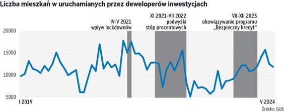 Według wstępnych szacunków GUS w maju deweloperzy w Polsce rozpoczęli budowę 11,9 tys. mieszkań, o 5,2 proc. mniej niż w kwietniu, w którym zanotowano 20-proc. spadek. Oznacza to powrót do aktywności obserwowanej w II połowie ub.r.