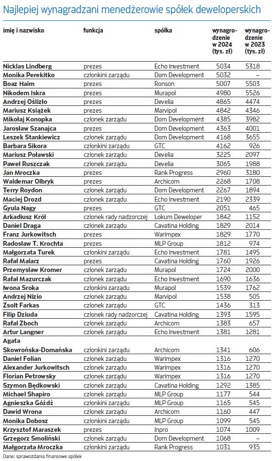 Na drugim miejscu znalazła się debiutantka Monika Perekitko, od początku 2024 r. członkini zarządu mieszkaniowej grupy Dom Development. Wynagrodzenie dla niej tylko nieznacznie ustępuje zainkasowanemu przez Nicklasa Lindberga. Menedżerka nie przepracowała jednak całego roku – w październiku złożyła rezygnację. Z 5,03 mln zł wynagrodzenia 3,8 mln zł to szacunkowa kalkulacja premii za 2024 r. Dom Development to budowniczy mieszkań, którego żadne spowolnienie się nie ima – sprzedaż drogich mieszkań jest rekordowa, a akcjonariusze co roku otrzymują coraz większą dywidendę.