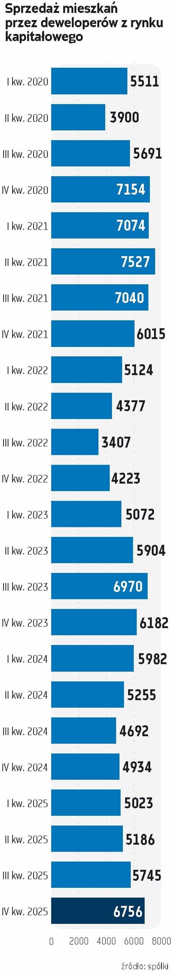 W IV kwartale 2025 r. szesnastu deweloperów z rynku kapitałowego sprzedało 6756 lokali, o 37 proc. więcej niż rok wcześniej i o 17,6 proc. więcej niż w III kwartale. To piąty kwartał z rzędu wzrostu sprzedaży oraz drugi, kiedy ta dynamika mocno przyspieszyła (w III kwartale wzrost sięgał 11 proc.). Wynik jest o zaledwie 3 proc. gorszy od ostatniego szczytu w III kwartale 2023 r., kiedy rynek czerpał pełnymi garściami z „Bezpiecznego kredytu” i o 10 proc. słabszy od rekordowego II kwartału 2021 r. napędzanego ultraniskimi stopami procentowymi.
