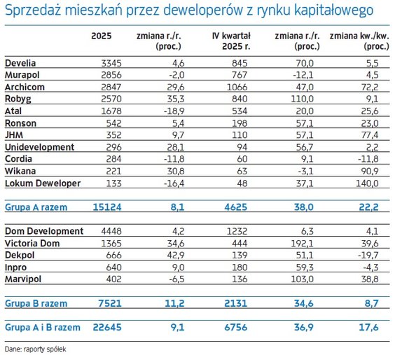 Tempo poprawy w ostatnich dwóch kwartałach 2025 r. robi wrażenie, w całym roku grupa sprzedała 22,7 tys. lokali, o 8,9 proc. więcej niż w 2024 r., ale też o 5,9 proc. mniej niż 2023 r.
