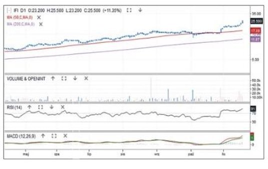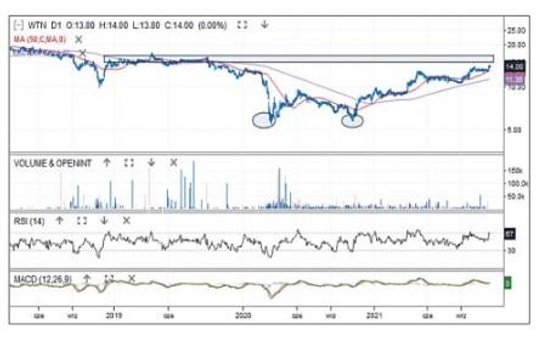 Od roku notowania akcji spółki sprzedającej odzież, buty i galanterię skórzaną są w trendzie wzrostowym. Zwyżka zaczęła się z podwójnego dna przy 5,5 zł, a w minionym tygodniu cena dotarła do 14,2 zł. Kurs wyszedł górą z płaskiej korekty, odbijając się od średniej 50-sesyjnej, a MACD zakręcił w górę nad linią 0. Cena kontynuuje hossę, a najbliższy cel to pasmo oporowe 15–16 zł. Jego pokonanie będzie potwierdzeniem siły popytu. Poziom 13 zł, gdzie znajdują się średnia z 50 sesji i dołek ostatniej korekty, pozostaje najbliższym wsparciem.