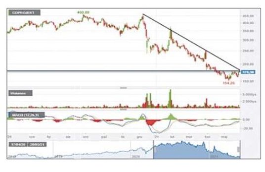 Akcje Tauronu wyraźnie zwyżkowały w kwietniu, a od początku roku zyskały około 26 proc. Maj przyniósł zadyszkę, choć pod koniec ubiegłego tygodnia kupujący znów ruszyli do ataku. Zwyżka zatrzymuje się jednak w okolicach szczytu z przełomu kwietnia i maja. Jest to okazja do utworzenia przez niedźwiedzie formacji podwójnego szczytu i np. powrotu przynajmniej do dolnego ograniczenia kanału, w którym akcje Tauronu poruszają się w ostatnim miesiącu. Kolejnego wsparcia należałoby szukać na linii trendu wzrostowego.