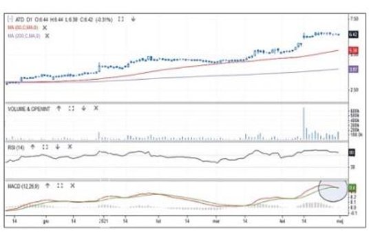 Kurs akcji przedstawiciela branży IT jest w długoterminowym trendzie wzrostowym, ale w ostatnim czasie przeszedł w fazę płaskiej korekty, konsolidując się przy szczycie. Do tego RSI(14) jest na poziomie 80 pkt, więc można mówić o fazie mocnego wykupienia. Wstępny sygnał sprzedaży pojawił się ponadto na MACD. Niewykluczone więc, że płaska korekta przejdzie w spadkową i przetestuje 50-sesyjną średnią. Ta ostatnia znajduje się przy 5,3 zł, a w piątek po południu za walor płacono 6,42 zł.
