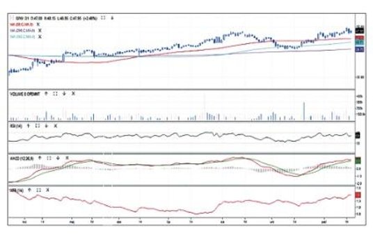 Sierpniowo-wrześniowo korekta notowań akcji warszawskiej giełdy zatrzymała się tuż powyżej linii średniej kroczącej z 200 sesji. Od miesiąca akcje drożeją, by na początku października wrócić nad średnią 50-sesyjną, a w ostatnią środę przebić poprzedni szczyt hossy 47,7 zł i wyznaczyć nowy 49,55 zł. Przy tak słabych nastrojach na szerokim rynku nowy rekord należy uznać za istotny przejaw siły. Wysoko położone oscylatory zwiększają ryzyko korekty, ale silne wsparcie w postaci 50-sesyjnej średniej jest blisko – przy 44,3 zł.