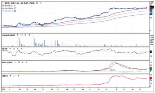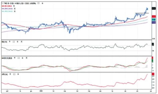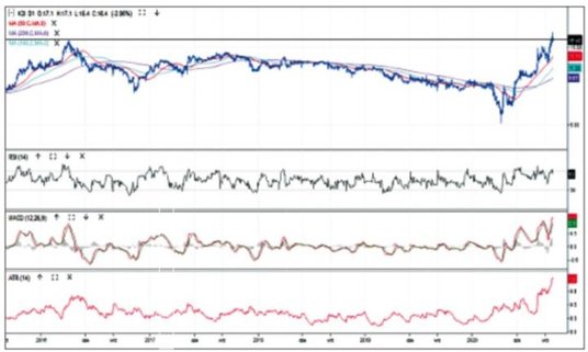Gwiazda „covidowej hossy" wróciła w minionym tygodniu na wzrostową ścieżkę. W piątek przed południem kurs rósł do 454 zł, a więc znalazł się najwyżej w historii notowań spółki. Warto zwrócić uwagę, że korekta została zatrzymana na linii średniej kroczącej z 50 sesji, a odbiciu w górę towarzyszył zwrot MACD w górę nad linią 0. Te dwa argumenty AT wspierają scenariusz kontynuacji hossy. Do pełni szczęścia brakuje potwierdzenia w wolumenie. Najbliższym wsparciem pozostaje wspomniana średnia, przebiegająca obecnie przy 344 zł.