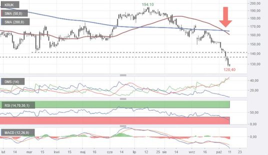 Akcje windykacyjnej spółki taniały w piątek nawet do 127,5 zł. To najniższy kurs od kwietnia 2015 r. i nowe minimum trwającej bessy. Niedźwiedzie po raz kolejny potwierdziły swoją długoterminową przewagę. Ich pozycję wzmacnia też krzyż śmierci, utworzony przez średnie z 50 i 200 sesji. Ponadto bez problemu pękła długoterminowa strefa wsparcia przy 140 zł. MACD i RSI(14) sygnalizują wyprzedanie, co może przynieść korektę. W szerszej ramie czasowej bardziej realna wydaje się kontynuacja wyprzedaży.