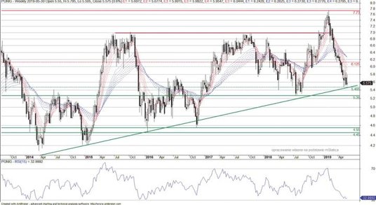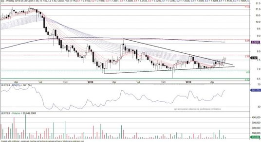 Wybicie górnego ograniczenia trójkąta symetrycznego osadzonego nad linią szyi wieloletniej struktury G&R, stanowi pretekst do podjęcia walki o wyprowadzenie wzrostowej kontry i oddalenie kursu od drażliwego wsparcia, jakim jest linia szyi. Wprawdzie nie można wykluczyć powstania układu „typu fake" przed odpadnięciem na południe, jednakże dopóki tygodniowe zamknięcie wypada powyżej 6,5 zł, dopóty kreski są na korzyść byków. Średnioterminowym oporem pozostaje strefa łącząca w sobie MA200_w (?8,58) i tegoroczny szczyt.