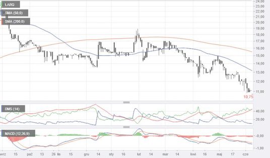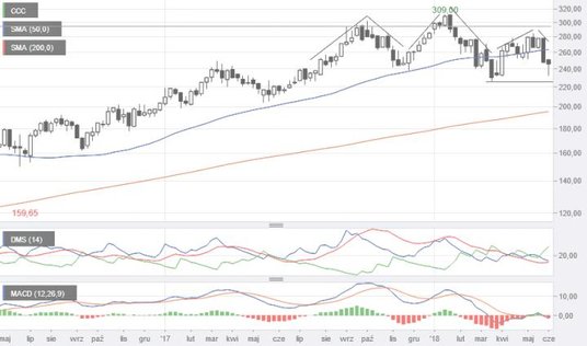 Wykres kursu akcji obuwniczej spółki prezentujemy w ujęciu tygodniowym, bowiem na nim uwidacznia się budowana formacja głowy z ramionami. Zgodnie z podręcznikiem analizy technicznej jest to struktura odwracająca trend, a więc niewykluczone, że CCC zacznie być kontrolowana przez niedźwiedzie. Potrzebne jest do tego przynajmniej przebicie ostatniego lokalnego dołka zlokalizowanego na poziomie 225,8 zł. Następną barierą będzie 200 zł, gdzie przebiega 200-sesyjna średnia krocząca.