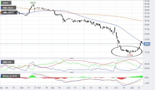 Przedstawiciel branży odszkodowawczej to propozycja dla inwestorów z mniejszą awersją do ryzyka, preferujących łapanie dołków. Na wykresie tytułowej spółki pojawiła się bowiem formacja spodka, która zgodnie z teorią zapowiada zmianę trendu. Wzrostowy scenariusz potwierdzają wskazania kupna na MACD i ADX, ale jednocześnie zwyżki zatrzymała w piątek średnia krocząca z 50 sesji (obecnie przy 21,5 zł). Jej przebicie powinno otworzyć drogę do wyższych pułapów, ale trzeba się liczyć z ryzykiem powrotu na ścieżkę bessy.