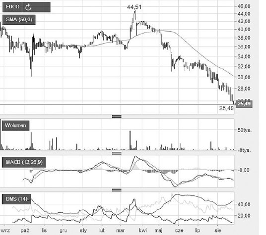 Kurs akcji Europejskiego Centrum Odszkodowań porusza się w trendzie spadkowym od dwóch lat. W marcu tego roku niedźwiedzie wyraźnie przyspieszyły. W efekcie w ciągu pięciu miesięcy akcje potaniały o 43 proc. Średnia krocząca z 50 sesji spada i jest powyżej aktualnej ceny, MACD zakręcił w dół poniżej linii zero, a wskaźnik ruchu kierunkowego pokazuje przewagę podaży. Technika jest więc po stronie sprzedających. Jeśli pęknie wsparcie 25 zł, następnym celem będzie 20 zł. Zasięg ewentualnej korekty to strefa 30–35 zł.