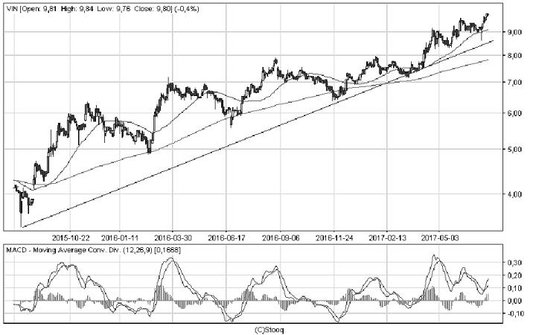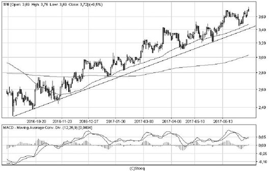 Branża energetyczna należała w ostatnich dniach do liderów zwyżek na GPW. WIG-energia wzrósł w ciągu pięciu sesji o 7 proc. i znalazł się najwyżej od listopada 2015 r. Warto zatem przyjrzeć się spółkom z jego portfela, w tym m.in. Tauronowi. Kurs jego akcji od września ubiegłego roku porusza się w stabilnym trendzie wzrostowym. Czerwcowa korekta zatrzymała się tuż nad 50-sesyjną średnią kroczącą, przebiegającą wzdłuż linii trendu. W ciągu ostatni kilku sesji byki odrobiły straty i w piątek kurs wyznaczył nowy szczyt hossy 3,76 zł.
