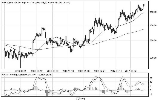 WIG-banki od maja przebywa w układzie korekty, ale nie wszyscy w portfelu poddają się temu trendowi. Pod prąd porusza się kurs akcji mBanku. W minionym tygodniu papiery podrożały o 5 proc. i w czwartek dotarły do 482,3 zł. Tak wysoko cena nie znajdowała się od maja 2015 r. Jest to nowy szczyt trendu wzrostowego i jednocześnie sygnał jego kontynuacji. Najbliższym celem byków powinien być okrągły poziom 500 zł. Z kolei silnym wsparciem jest okolica 450 zł, gdzie znajdują się 50-sesyjna średnia krocząca i dołek ostatniej korekty.