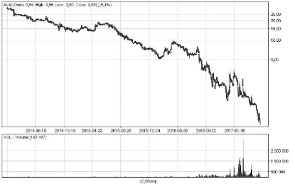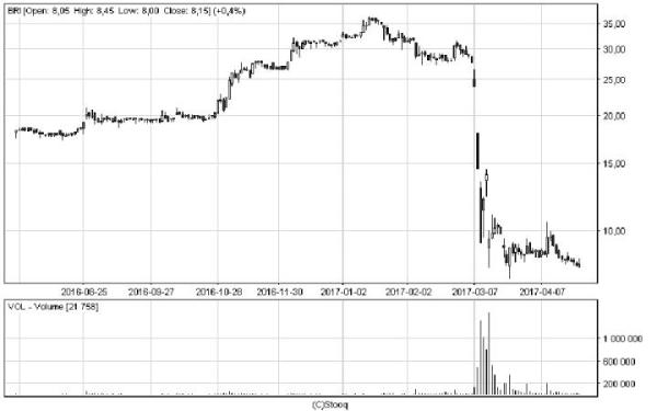 O 73 proc. potaniały od początku roku akcje właściciela sieci delikatesów. Z technicznego punktu widzenia nie jest to przypadek, tylko po prostu kontynuacja bessy. Spółka ma bowiem za sobą trzy spadkowe lata z rzędu. W 2016 r. spadek sięgnął 74 proc., w 2015 r. – 50 proc., a w 2014 r. 58 proc. W ostatni piątek kurs spadał w porywach do 0,5 zł, a więc znalazł się najniżej w historii. Groszowa wycena daje oczywiście możliwość zarobienia na dynamicznych korektach, ale w szerszym ujęciu czasowym firma pozostaje pod presją niedźwiedzi.