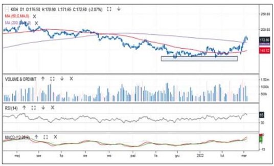 W ostatnim czasie inwestorzy szukają ekspozycji na rynek surowców. Najbardziej zyskiwały spółki węglowe (JSW, Bogdanka), ale miedziowy gigant także radzi sobie obiecująco. Zwyżki jego notowań nie są tak dynamiczne, ale może lepiej postawić na spokój niż na swoiste szaleństwo? Kurs akcji KGHM zatrzymał trend spadkowy w strefie 133–131 zł i od początku lutego stopniowo zwyżkuje. Udało się wrócić nad średnie z 50 i 200 sesji, a MACD zakręcił w górę na linii 0. Na wykresie zarysował się spodek, co wpisuje się w scenariusz zmiany trendu. Najbliższy opór to 200 zł, a wsparcie 167 zł.