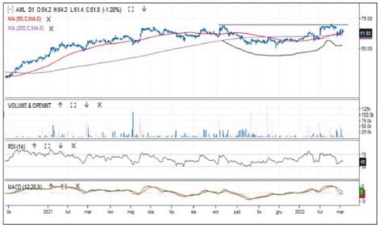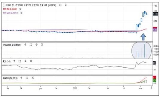 Patrząc przez pryzmat stopy zwrotu z akcji, największym beneficjentem wojny na Ukrainie jest producent osłon balistycznych i kamizelek kuloodpornych. W ciągu 10 ostatnich sesji walory Lubawy podrożały o blisko 270 proc. Wybicie notowań poprzedzone było formacją bazy, czyli wąską konsolidacją w strefie 1,30–1 zł. W czwartek kurs sięgał nawet 5 zł, a średnie z 50 i 200 sesji utworzyły złoty krzyż. Wybiciu towarzyszyły wyraźnie zwiększone obroty. W krótkim terminie rynek jest wykupiony (RSI(14) sięgał w piątek 84 pkt), ale w długim widać silne sygnały popytowego przesilenia.