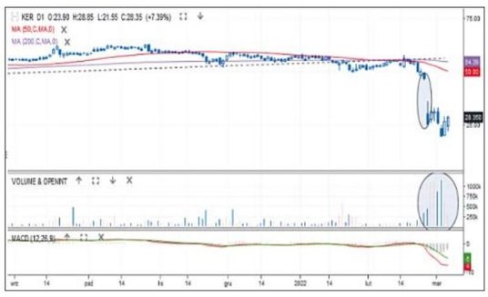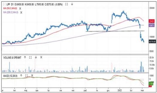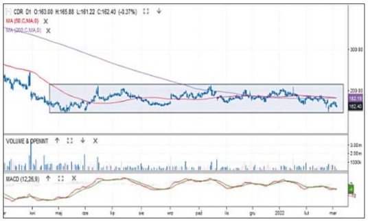 Wojna dotyka też bezpośrednio polskie spółki. Odzieżowy gigant informował, że dokona odpisu wartości aktywów w Rosji i Ukrainie na łącznie 520 mln zł. Cena akcji spada wprawdzie już od połowy stycznia, ale w ostatnim czasie presja podaży wyraźnie się zwiększyła. Kurs najpierw luką spadkową przełamał wsparcie 12 000 zł, by w minionym tygodniu przebić okrągłą barierę 10 000 zł. W piątek po południu cena spadała nawet do 7915 zł. To najniższy poziom od roku. Średnia z 50 sesji zwróciła się w dół i zbliża się do 200-sesyjnej. Skala strat i sytuacja na wykresie uprawniają do mówienia o bessie.