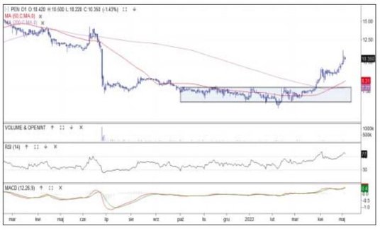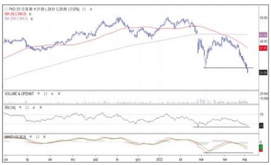 Miedziowy gigant jest od połowy kwietnia pod dużą presją podaży. Wcześniej cena nie sforsowała oporu 200 zł, a złoty krzyż na średnich z 50 i 200 sesji okazał się fałszywym wskazaniem. W minionym tygodniu cena przebiła strefę wsparcia 133–131 zł i znalazła się najniżej od listopada 2020 r. Spółce nie pomaga taniejąca miedź, a także niższe w ujęciu rocznym wyniki sprzedaży surowca za marzec. Oscylatory MACD i RSI sygnalizują już wyprzedanie, co daje szanse na odbicie. Pokonane wsparcie jest teraz oporem. Z kolei w strefie 115–110 zł znajdują się najbliższe bariery.