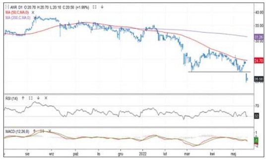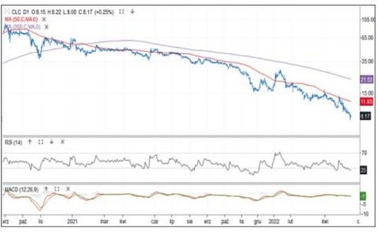 Od sierpnia 2020 r. kurs akcji spółki z branży energetyki odnawialnej porusza się w trendzie spadkowym. Od stycznia 2021 r. cena ani razu, mimo wzrostowych korekt, nie przebiła się przez strefę oporów między średnimi z 50 i 200 sesji. Ostatnia próba, z kwietnia, zakończyła się szybkim zwrotem na południe i podwyższonymi obrotami. Cena spada do dziś, a w minionym tygodniu dotarła do 7,33 zł. To najniższy poziom od października 2019 r. Wśród płynnych spółek z NewConnect jest to jeden z najsłabszych podmiotów w ujęciu krótkoterminowym, a jednocześnie najbardziej wyprzedany według RSI.